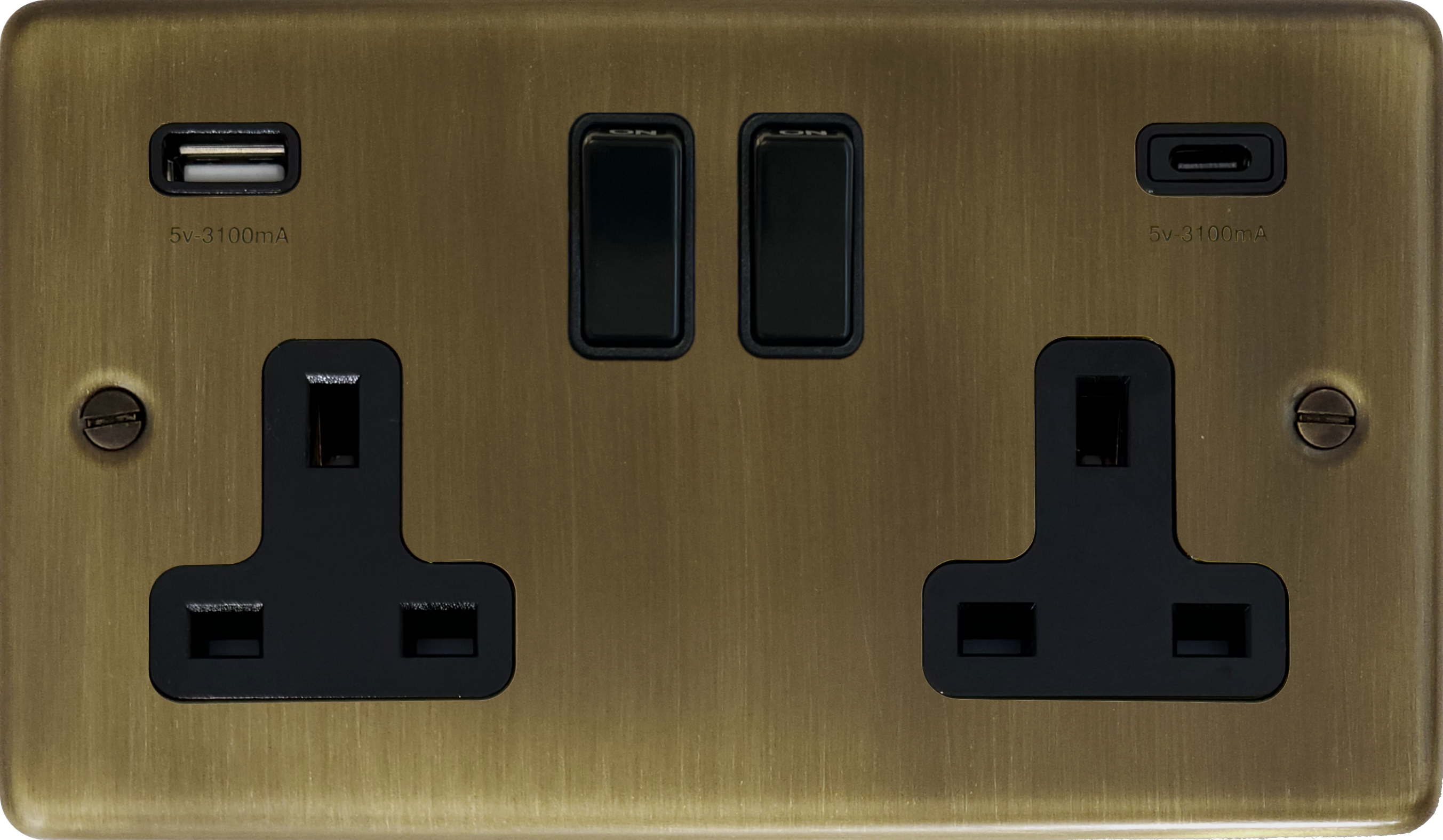 Antique Brass Double Socket with USB (USB-A and USB-C/Antique Brass Switches) - G+H CAB911B