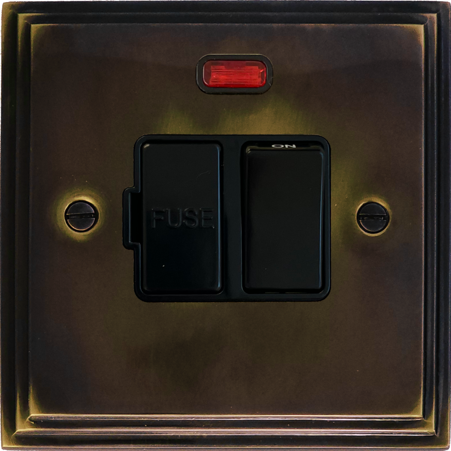 Cast Aged Brass Switched Fused Spur with Neon (Black Switch) - G+H VAN27B