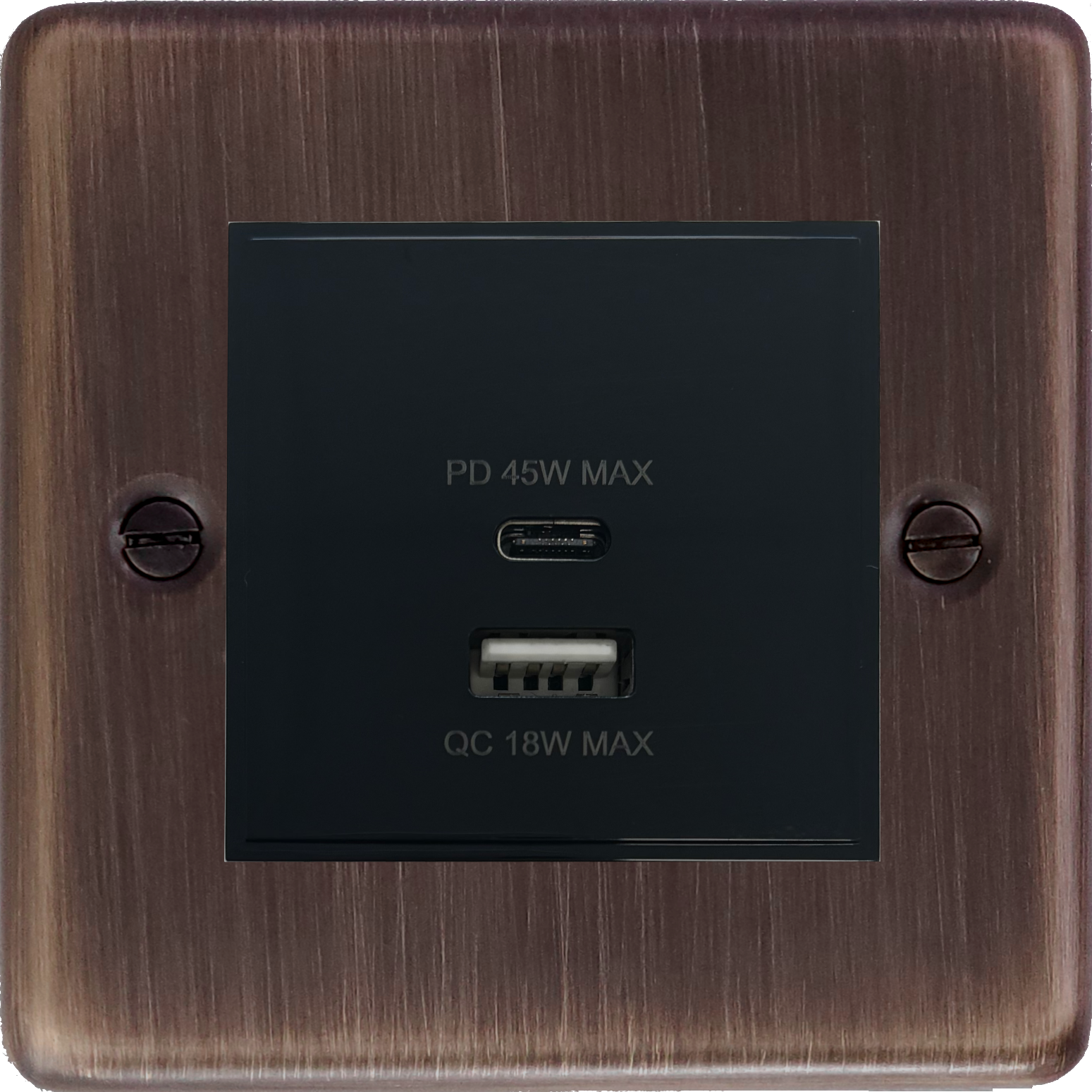 Contour Antique Copper USB Charger (Dual USB A + C Quick Charge) (1 Gang/Black Insert) - G+H CAC43B