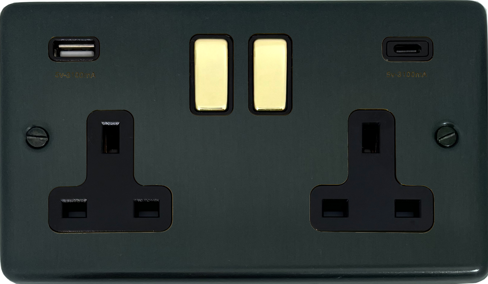 Contour Black Bronze Double Socket (2 Gang/USB-A and USB-C/Polished Brass Switches) - G+H CBB3911-PB