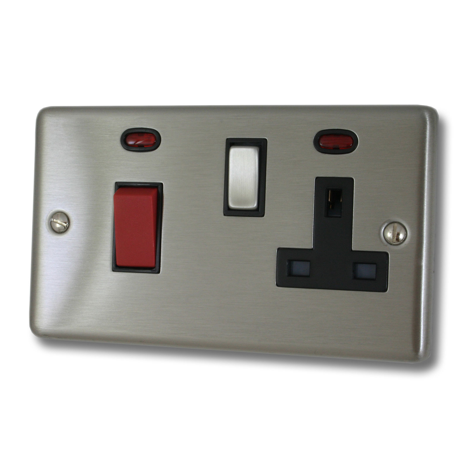 Contour Brushed Steel Cooker Switch with Socket (Black Insert/Satin Chrome Switch) - G+H CSS329