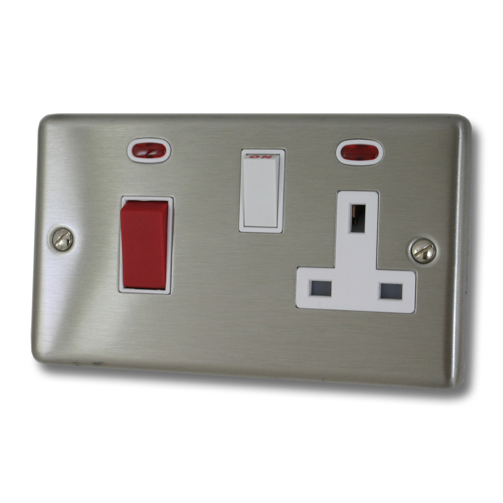 Contour Brushed Steel Cooker Switch with Socket (White Switch) - G+H CSS29W