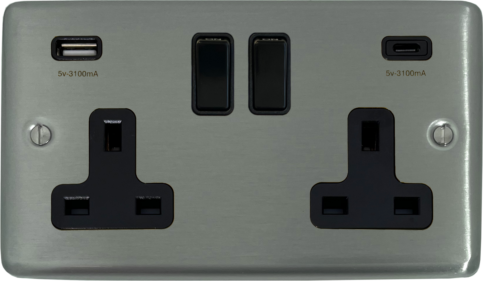 Contour Brushed Steel Double Socket with USB (2 Gang/USB-A and USB-C/Black Switches) - G+H CSS911B