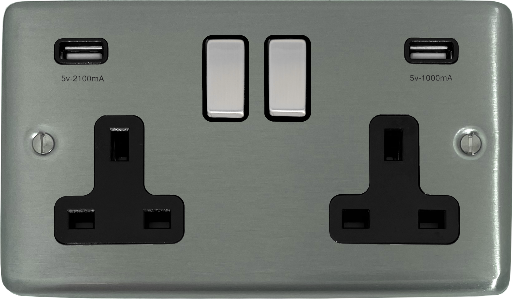 Contour Brushed Steel Double Socket with USB (Black Insert/Satin Chrome Switches) - G+H CSS3910