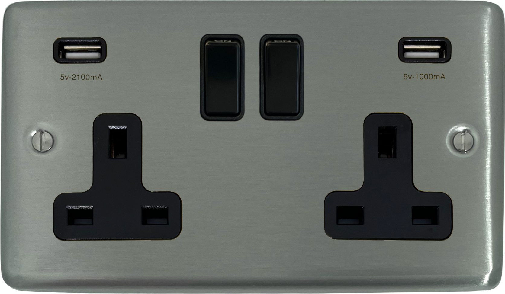 Contour Brushed Steel Double Socket with USB (Black Switches) - G+H CSS910B