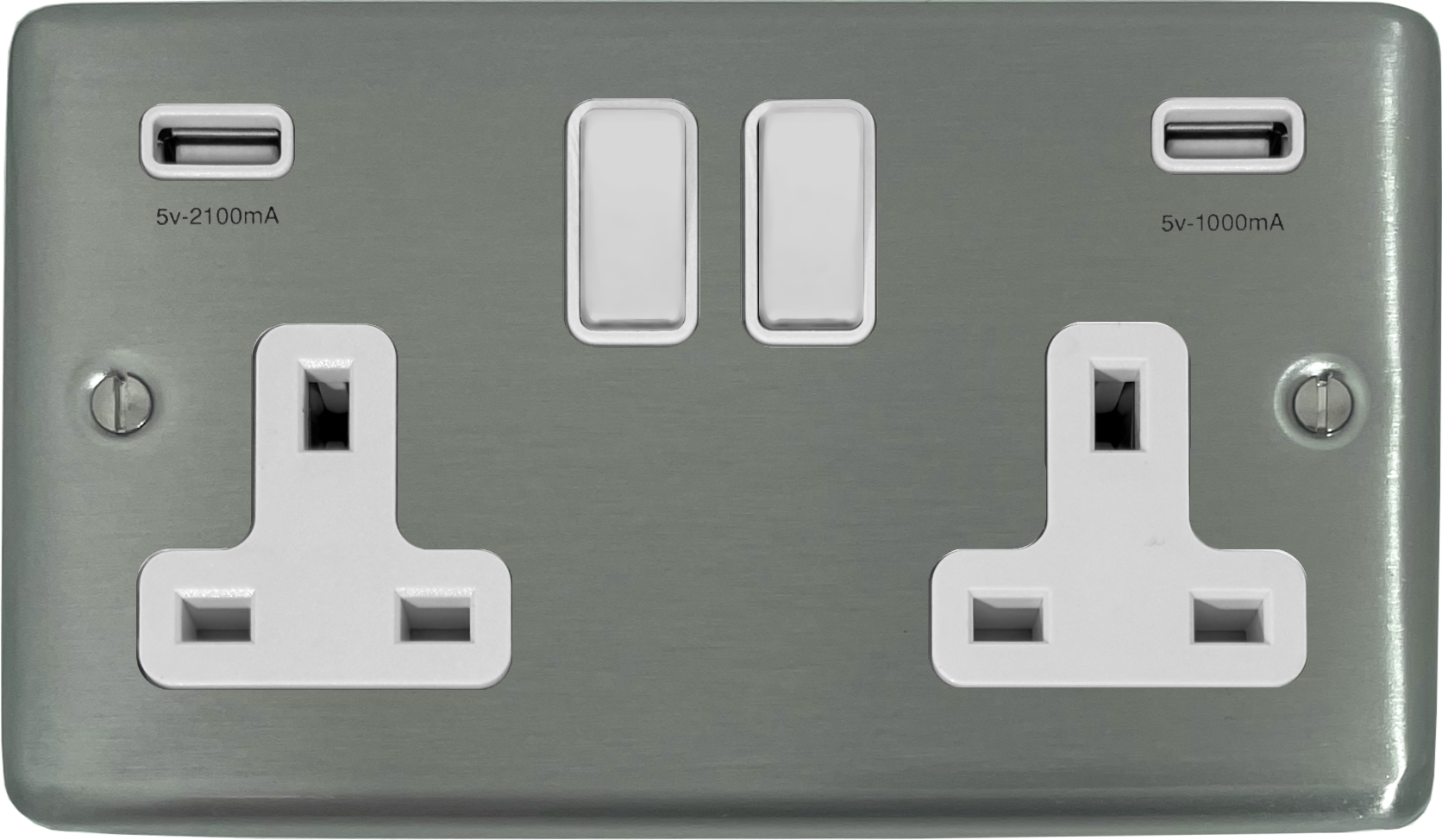 Contour Brushed Steel Double Socket with USB (White Switches) - G+H CSS910W