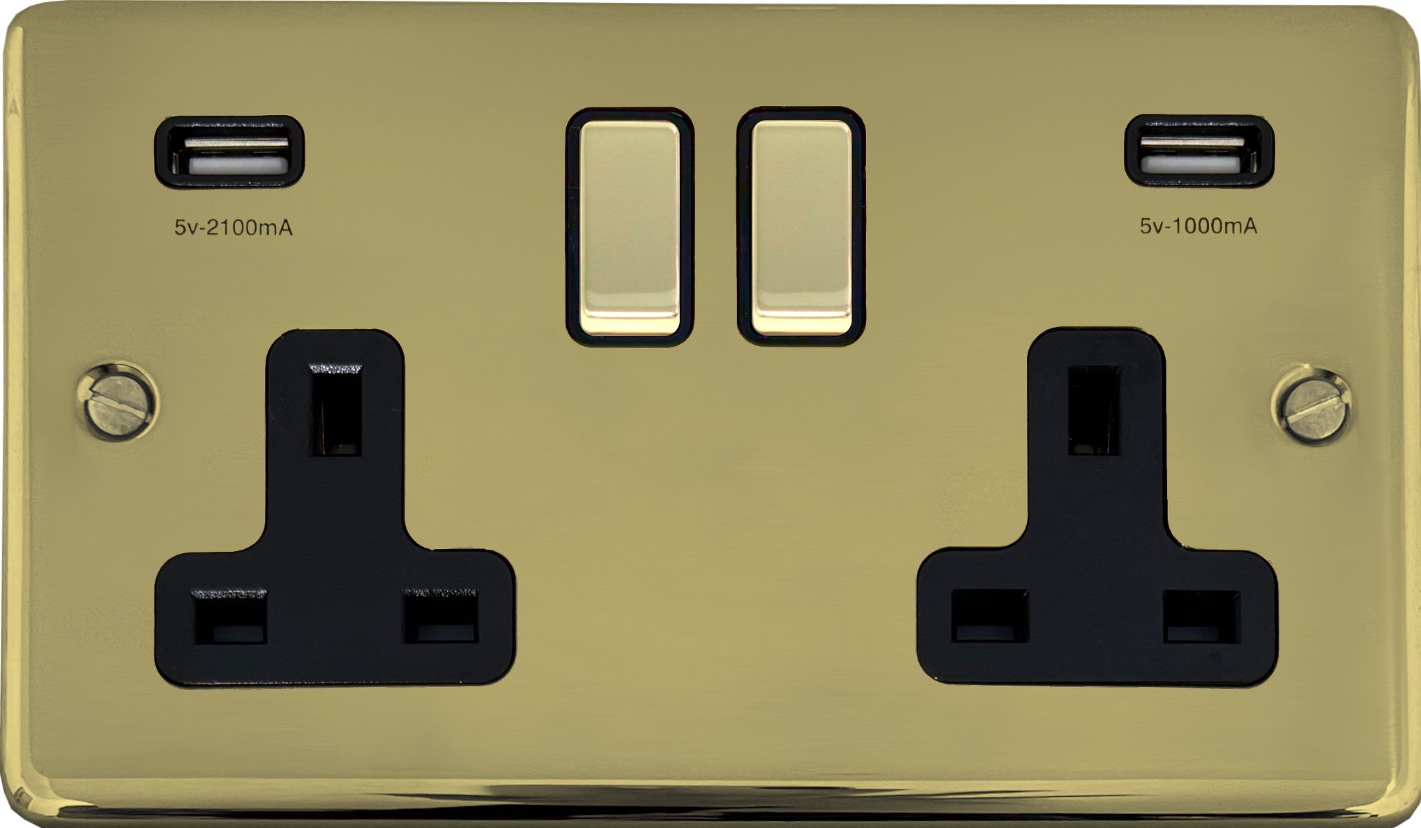 Contour Polished Brass Double Socket with USB (Brass Switches) - G+H CB3910
