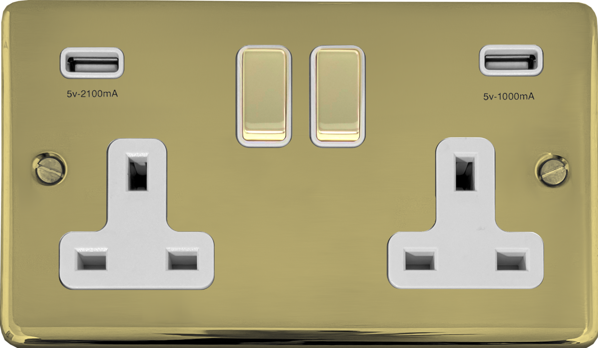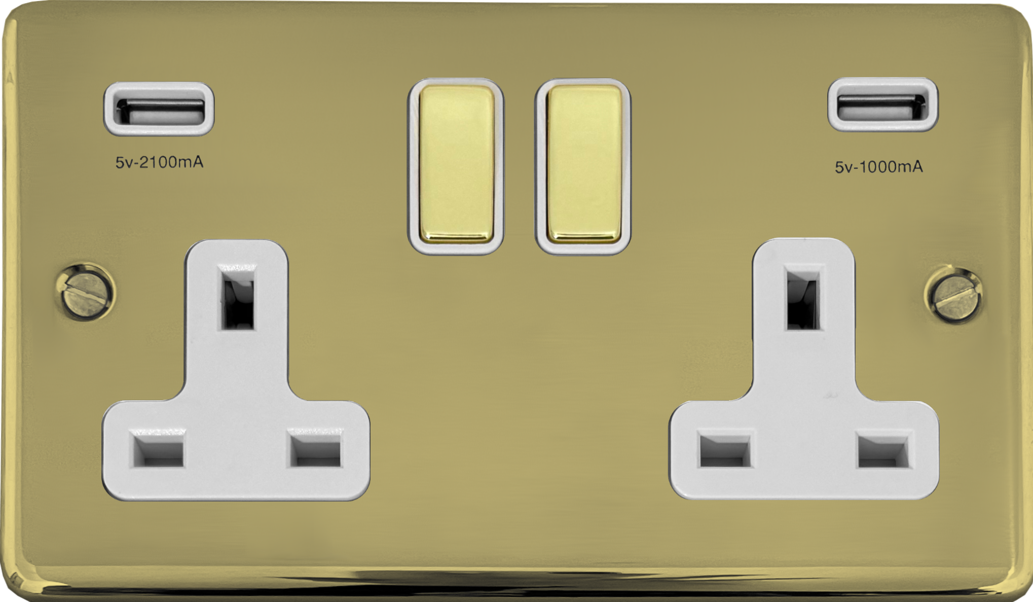 Contour Polished Brass Double Socket with USB (Brass Switches/White Inserts) - G+H CB2910