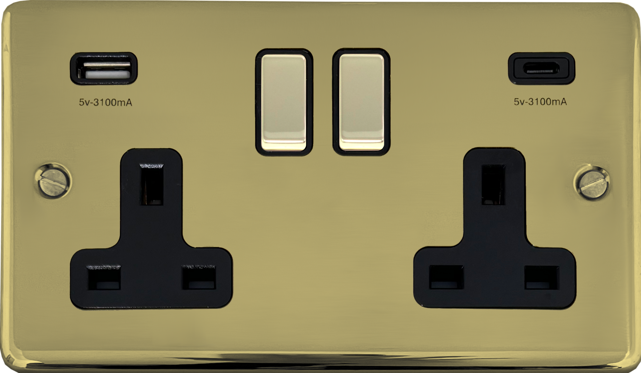 Contour Polished Brass Double Socket with USB (USB-A and USB-C/Black Inserts Brass Switches) - G+H CB3911