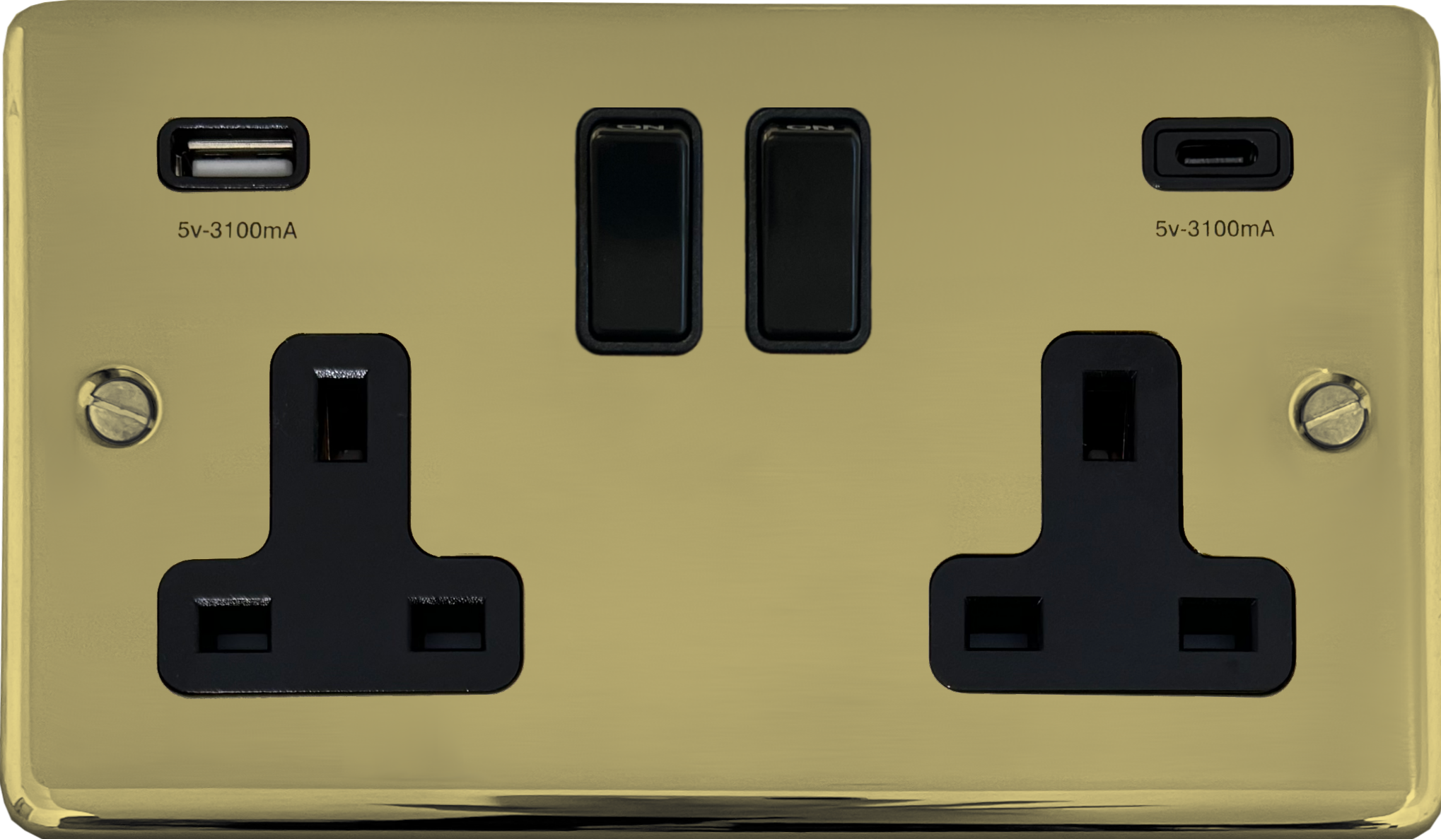 Contour Polished Brass Hand Waxed Double Socket with USB (USB-A and USB-C/Black Switches) - G+H CHX911B