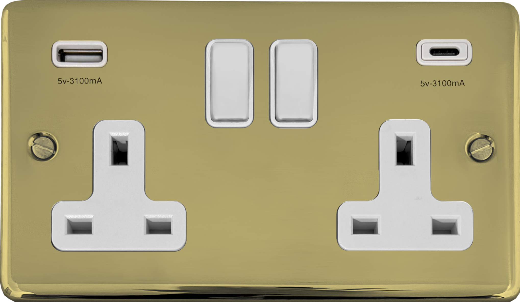 Contour Polished Brass Unlacquered Double Socket with USB (USB-A and USB-C/White Switches) - G+H CBUL911W