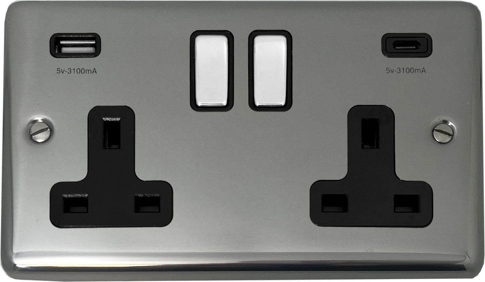Contour Polished Steel Double Socket with USB (USB-A and USB-C/Black Inserts/Steel Switches) - G+H CPS3911