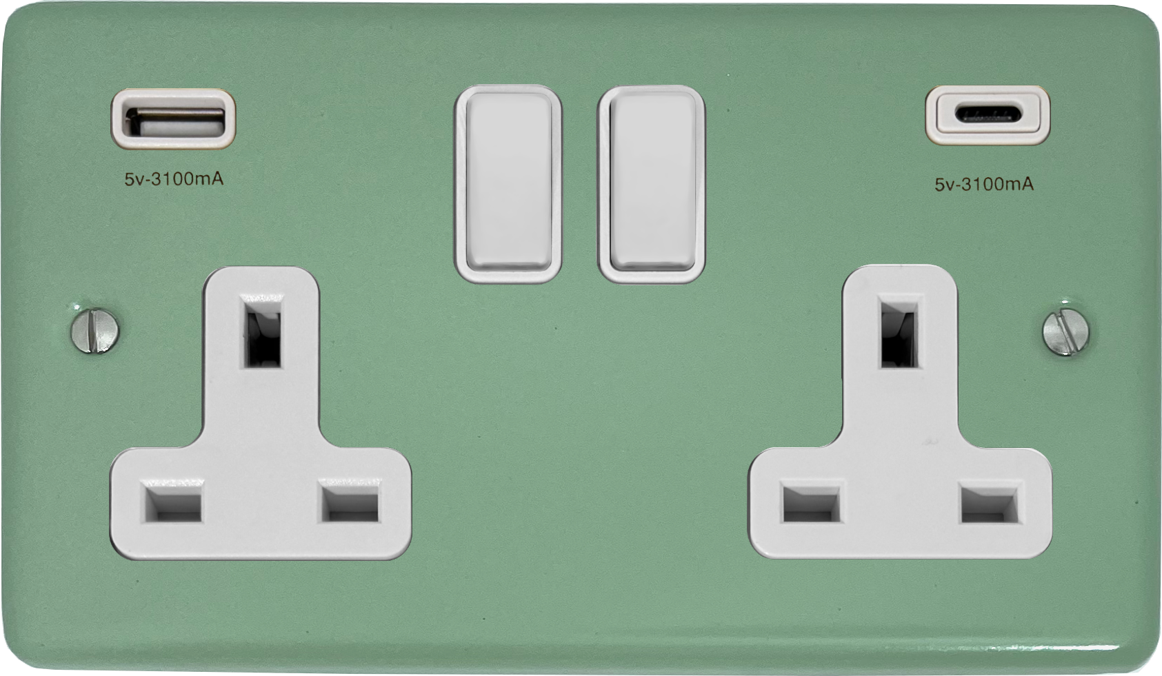 Contour Sage Green Double Socket with USB (2 Gang/USB-A and USB-C/White Switches) - G+H CSG911W