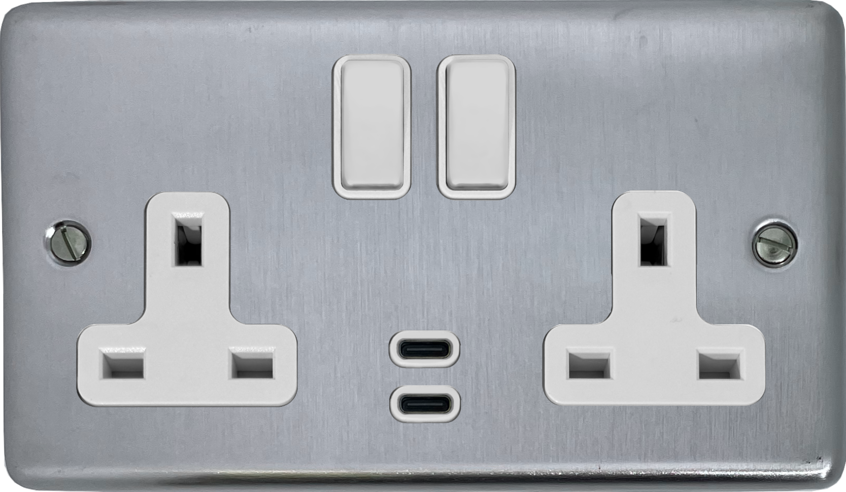 Contour Satin Chrome Double Socket with Dual USB-C (White Switches)