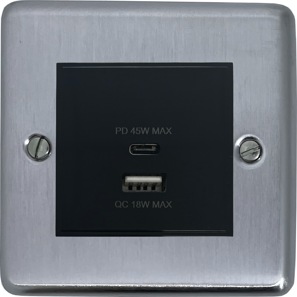 Contour Satin Chrome USB Charger (Dual USB A + C Quick Charge) (1 Gang/Black Insert) - G+H CSC43B