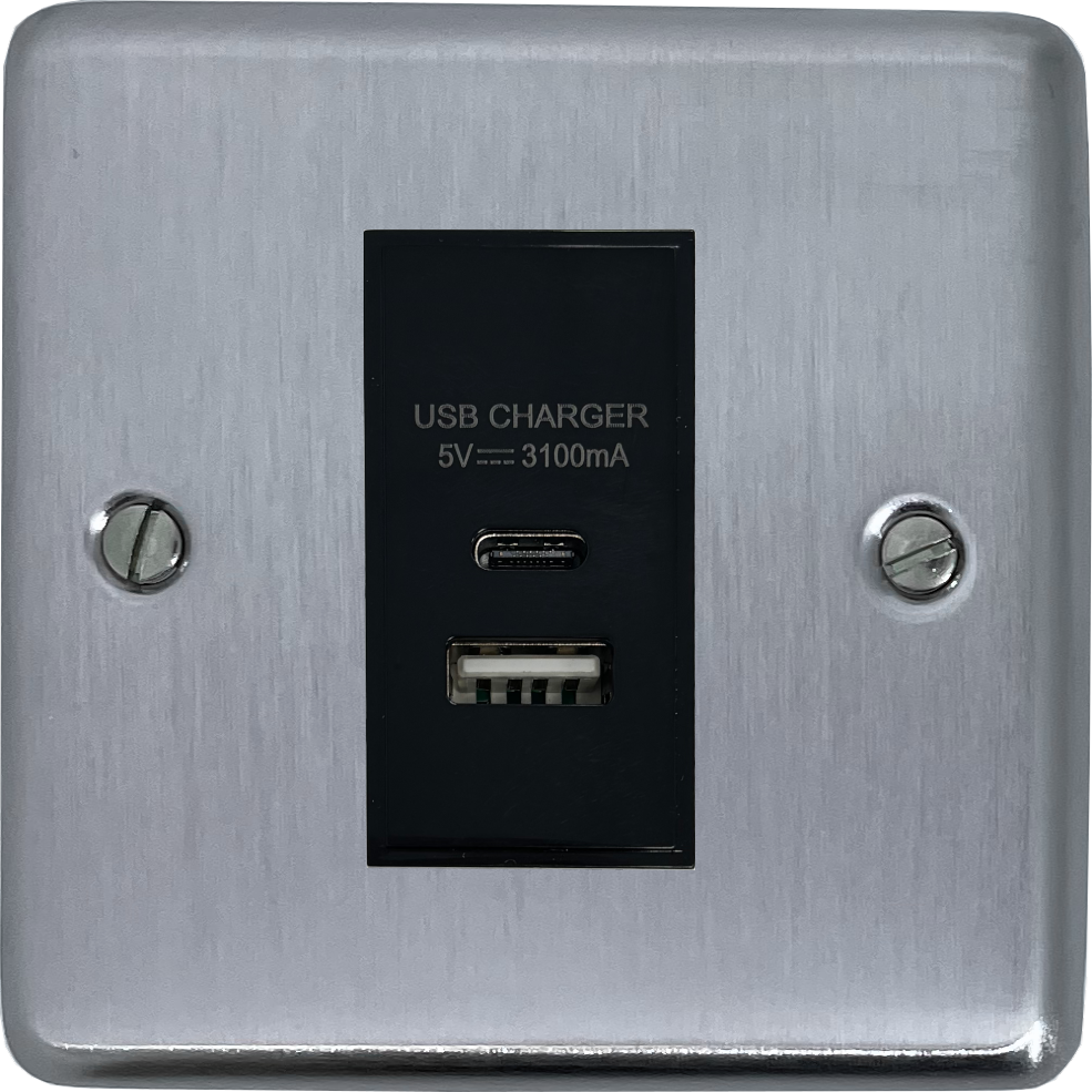 Contour Satin Chrome USB Charger (USB-A and USB-C) (1 Gang/Black Insert) - G+H CSC41B