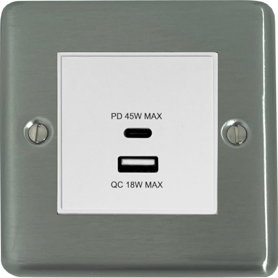 Contour Stainless Steel USB Charger (Dual USB A + C Quick Charge) (1 Gang/White Insert) - G+H CSS43W