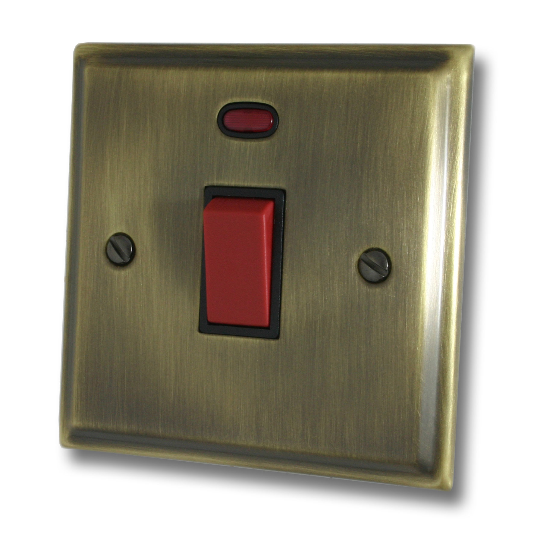 Deco Antique Brass 45A DP Switch with Neon (Red Switch)
