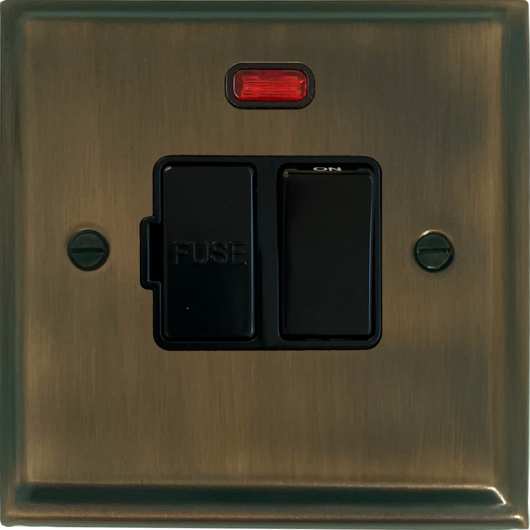 Deco Antique Brass Switched Fused Spur with Neon (Black Switch) - G+H DAB27B