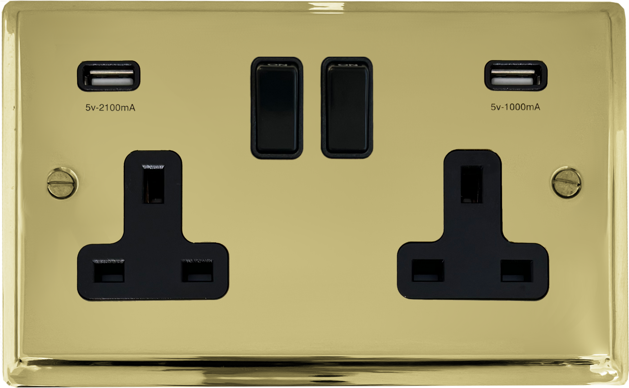 Deco Polished Brass Double Socket with USB (Black Switches) - G+H DB910B