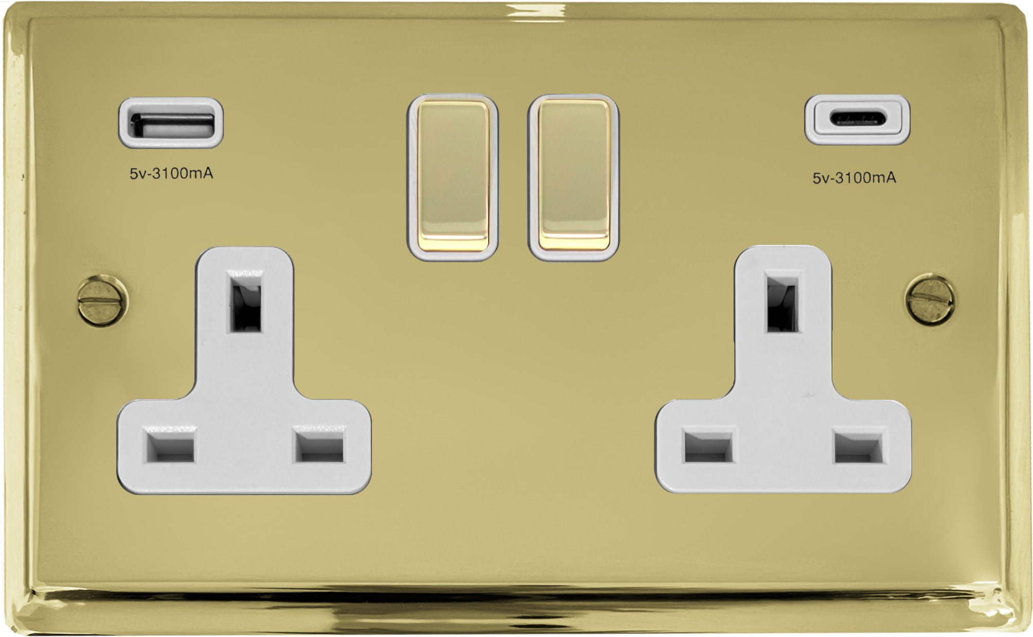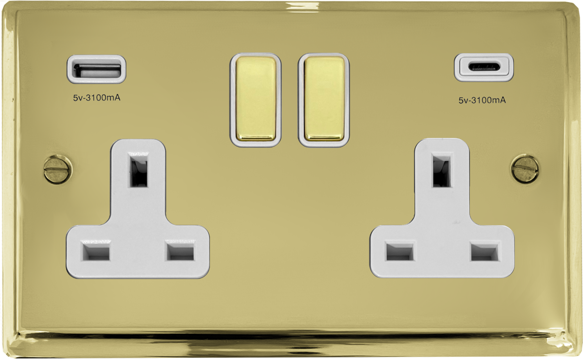 Deco Polished Brass Double Socket with USB (USB-A and USB-C/White Inserts Brass Switches) - G+H DB2911