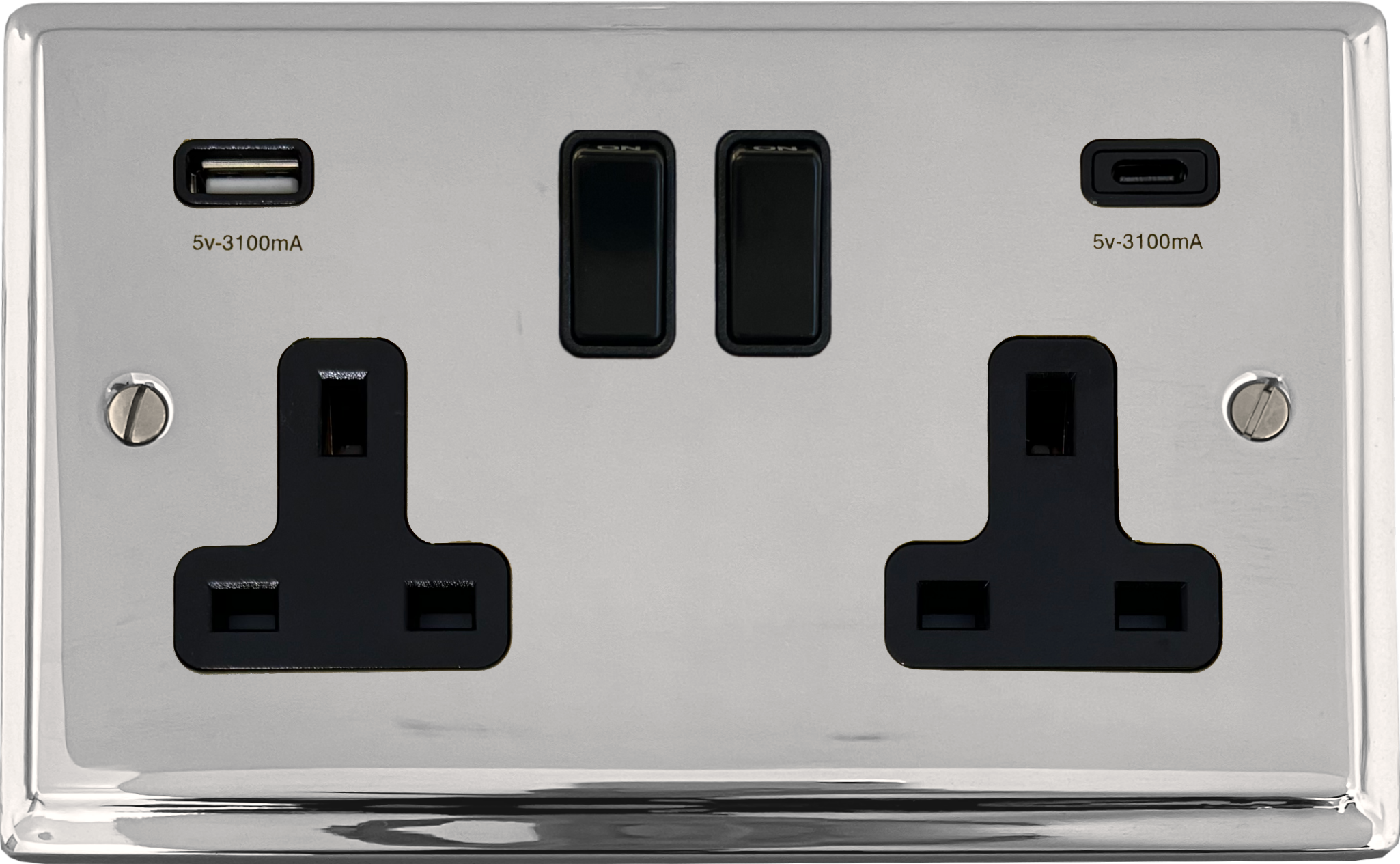 Deco Polished Chrome Double Socket with USB (USB-A and USB-C/Black Switches) - G+H DC911B