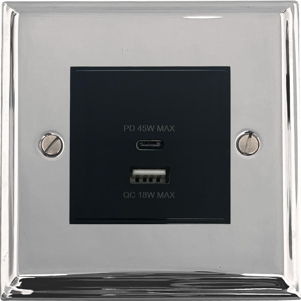 Deco Polished Chrome USB Charger (Dual USB A + C Quick Charge) (1 Gang/Black Insert) - G+H DC43B