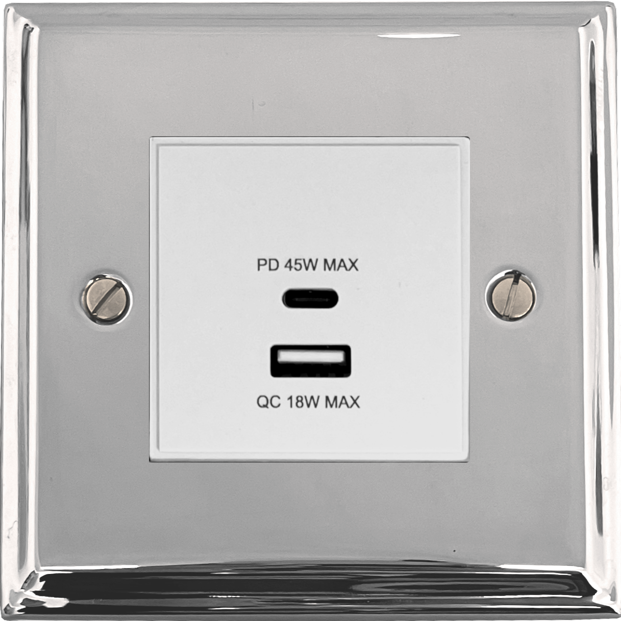 Deco Polished Chrome USB Charger (Dual USB A + C Quick Charge) (1 Gang/White Insert) - G+H DC43W