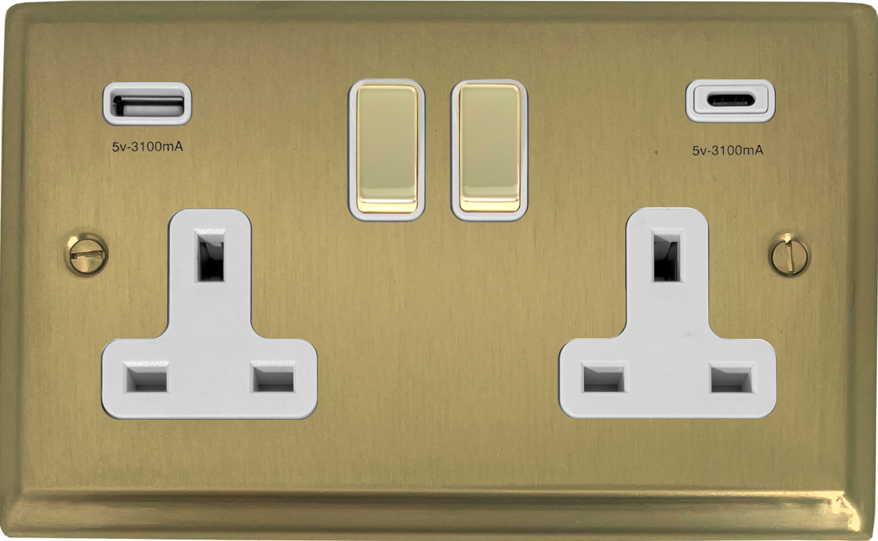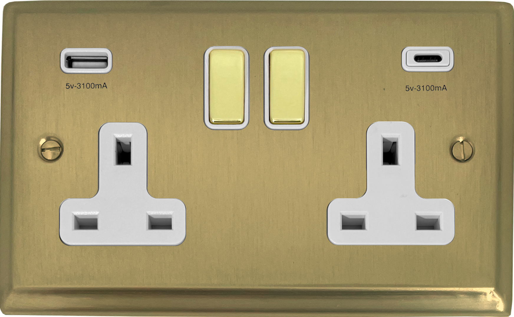 Deco Satin Brass Double Socket with USB (USB-A and USB-C/White Inserts Brass Switches) - G+H DSB2911