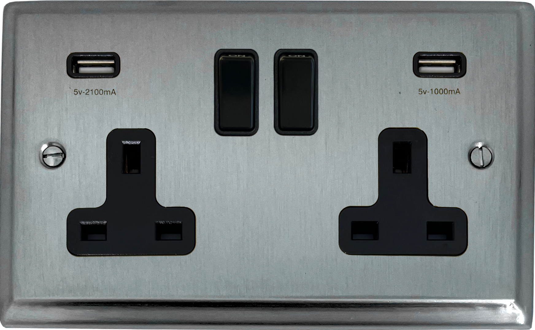 Deco Satin chrome Double Socket with USB (Black Switch) - G+H DSC910B