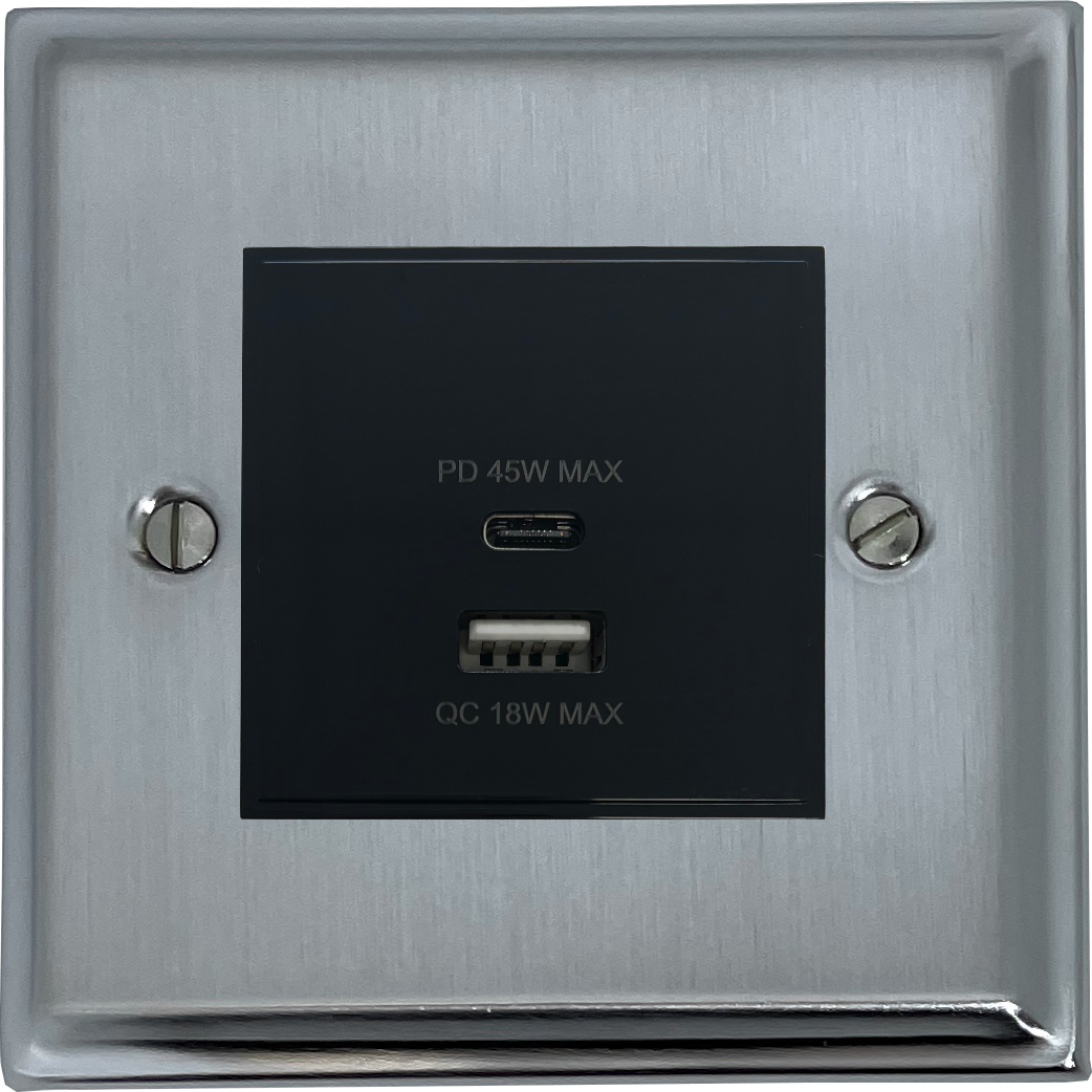 Deco Satin chrome USB Charger (Dual USB A + C Quick Charge) (1 Gang/Black Insert) - G+H DSC43B