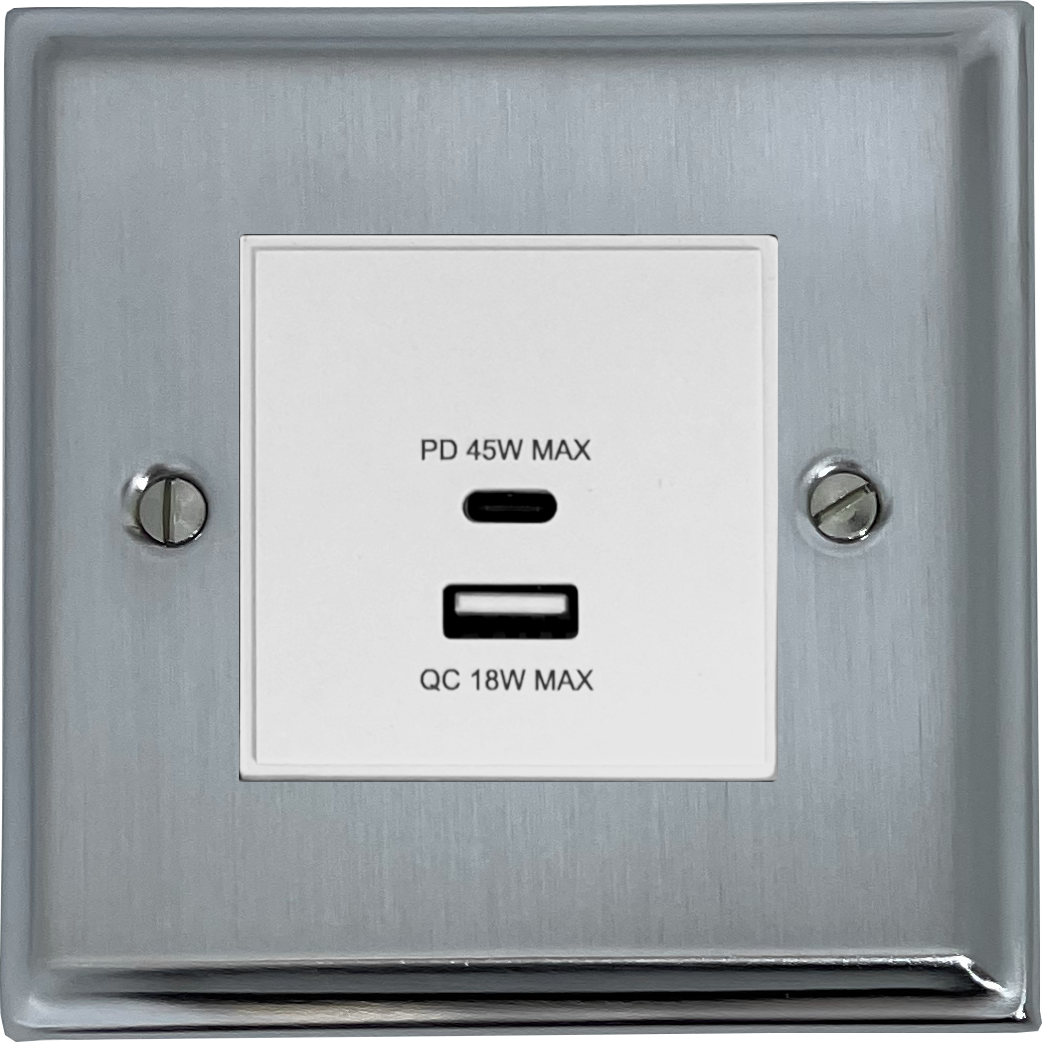 Deco Satin chrome USB Charger (Dual USB A + C Quick Charge) (1 Gang/White Insert) - G+H DSC43W