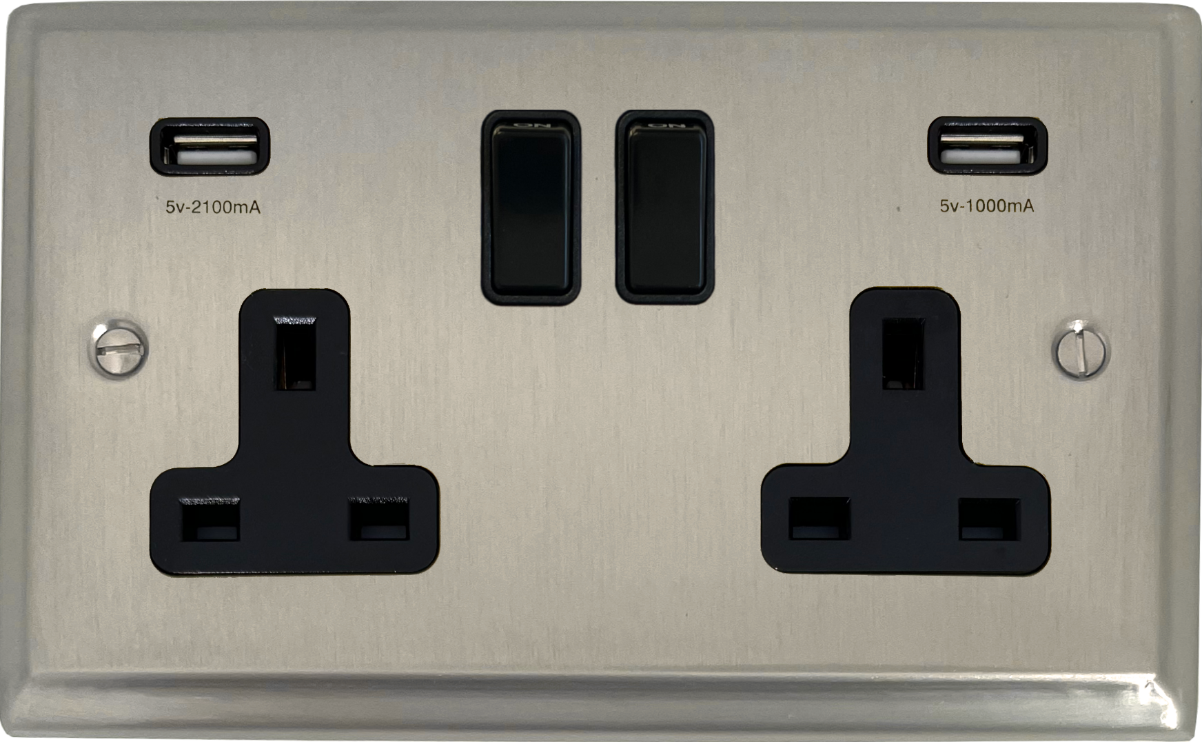 Deco Satin Nickel Double Socket with USB (Black Switch) - G+H DSN910B