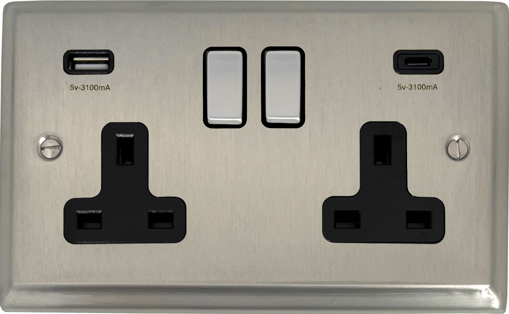 Deco Satin Nickel Double Socket with USB (USB-A and USB-C/Black Inserts/Matching Switches) - G+H DSN3911