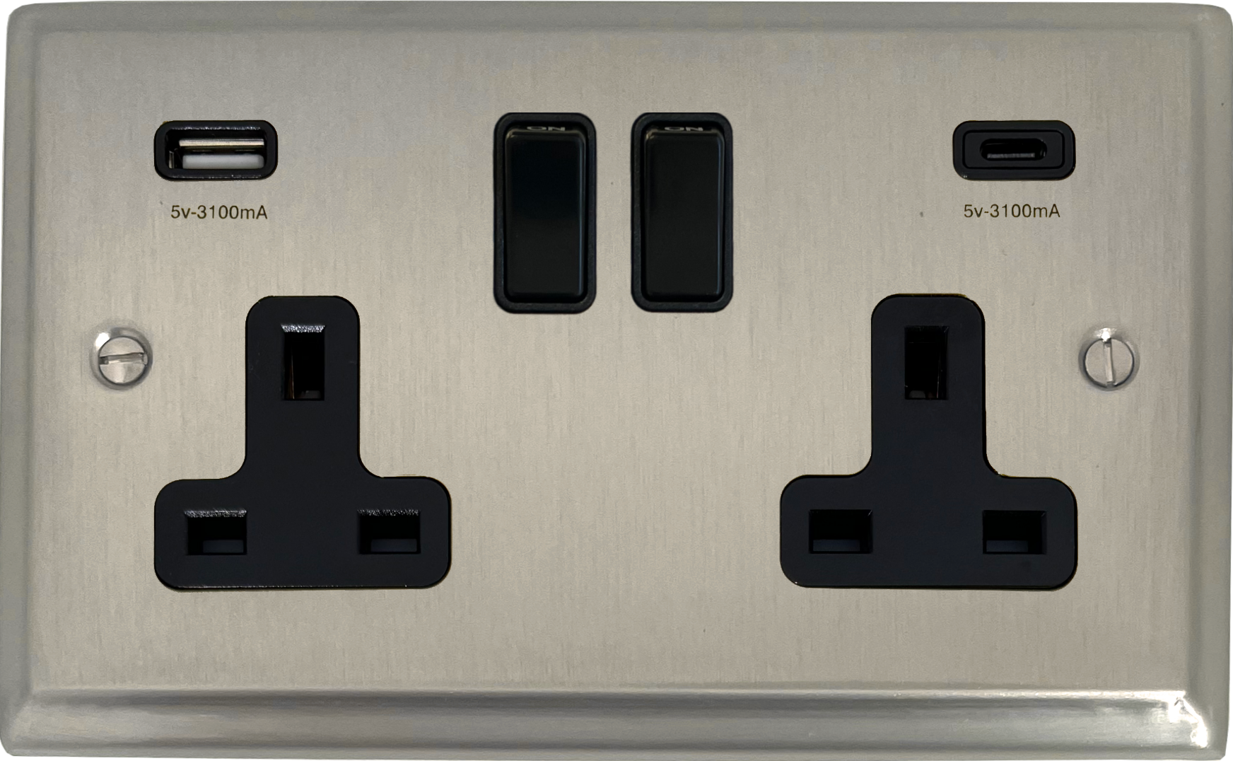 Deco Satin Nickel Double Socket with USB (USB-A and USB-C/Black Switches) - G+H DSN911B