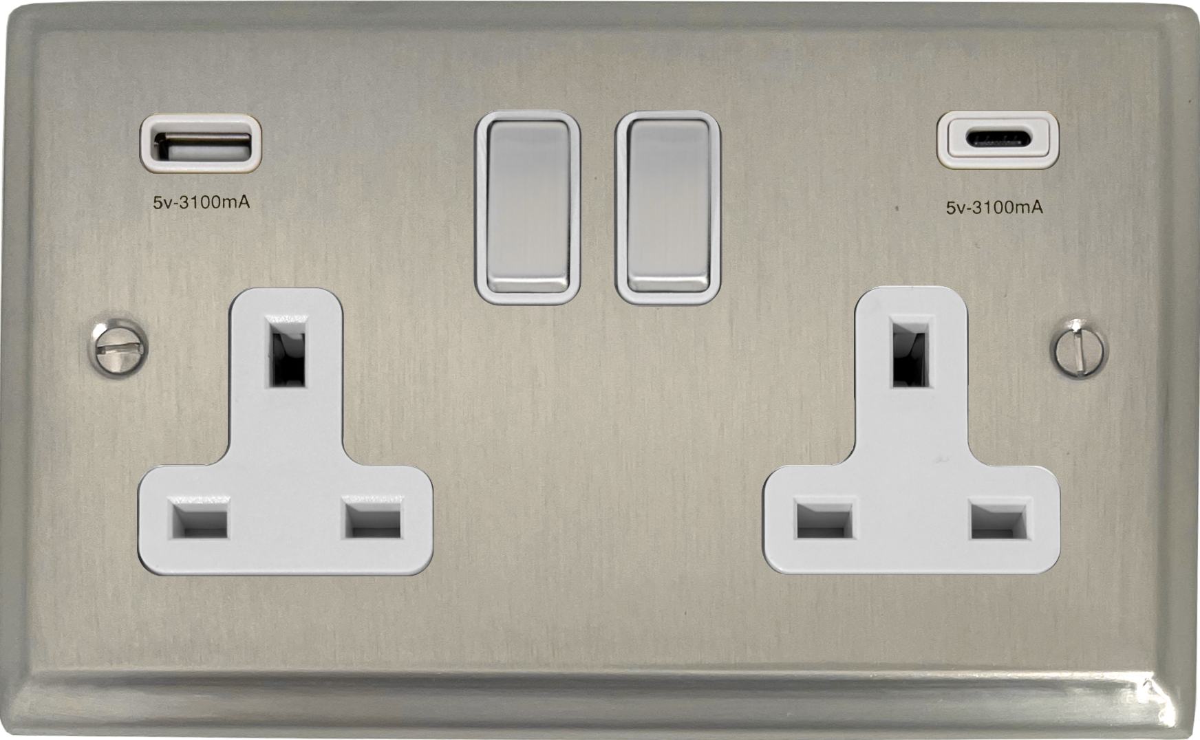 Deco Satin Nickel Double Socket with USB (USB-A and USB-C/White Inserts/Matching Switches) - G+H DSN2911