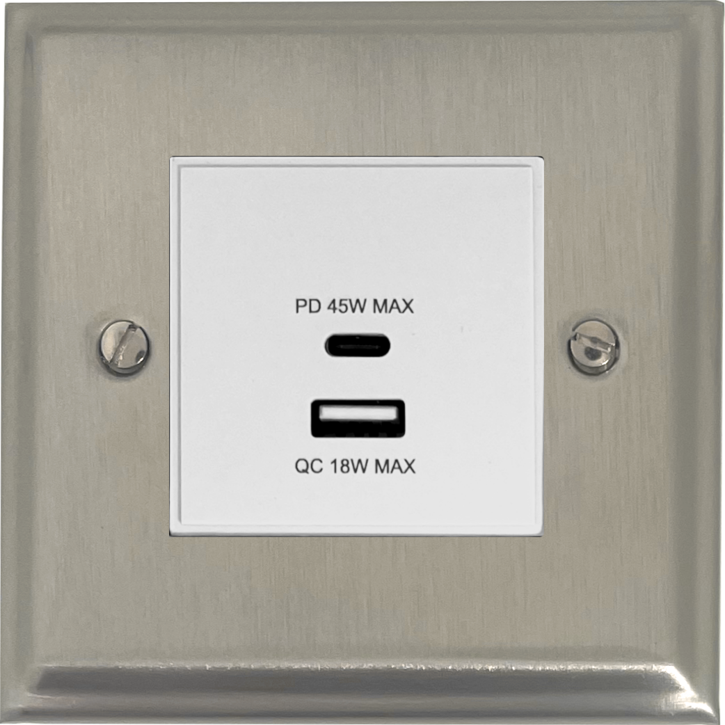 Deco Satin Nickel USB Charger (Dual USB A + C Quick Charge) (1 Gang/White Insert) - G+H DSN43W
