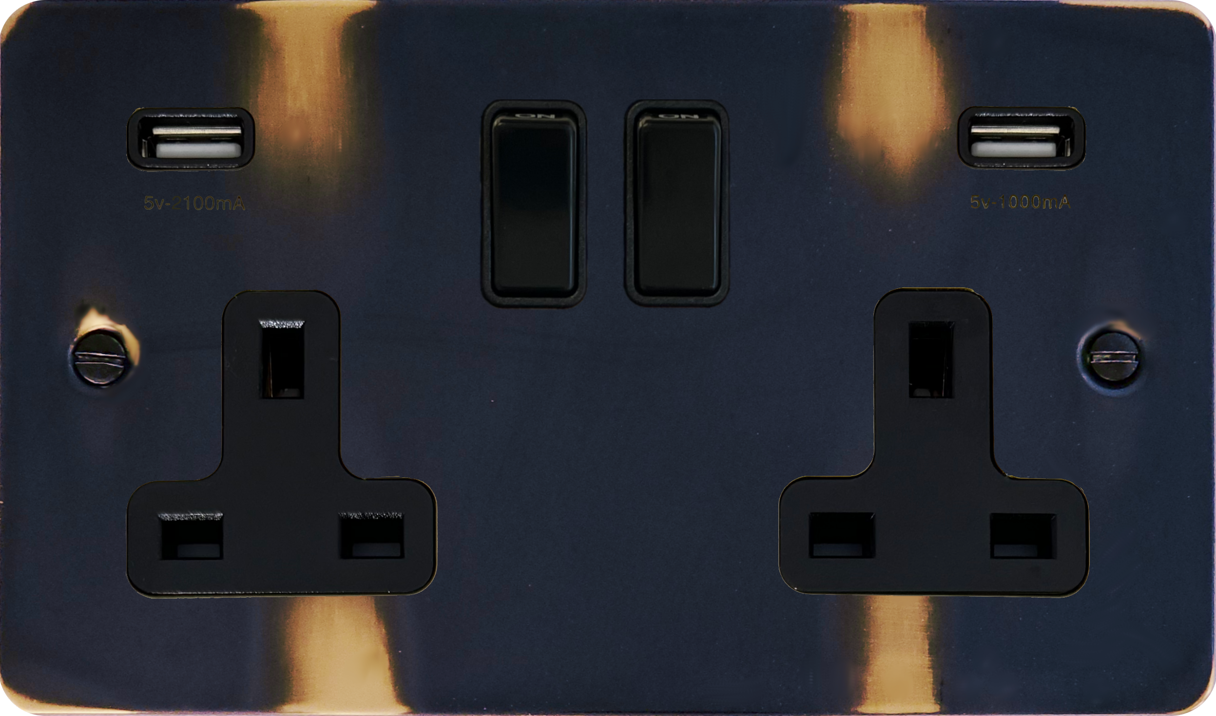 Flat Aged Brass Double Socket with USB (Black Switches) - G+H FAN910B