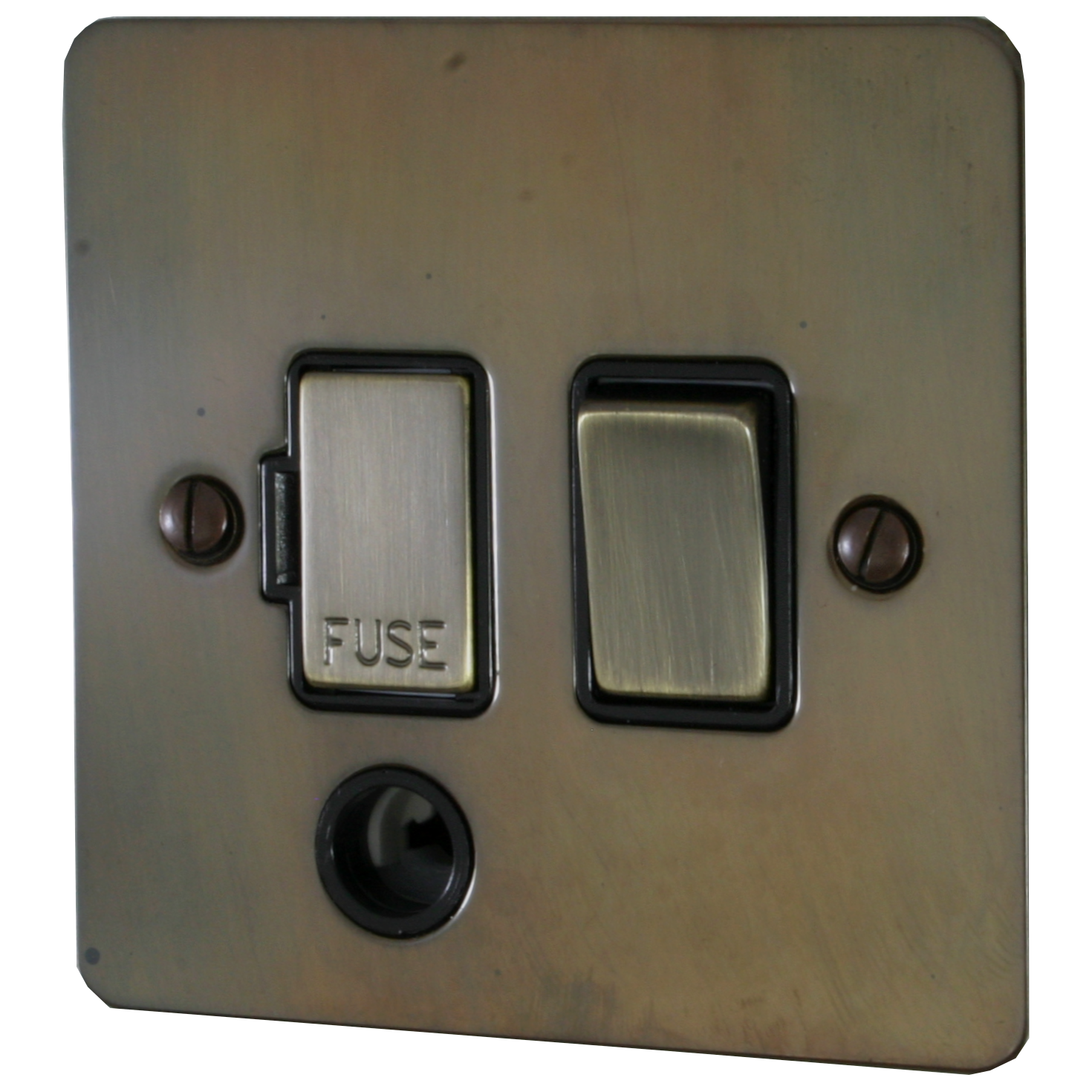 Flat Aged Brass Switched Fused Spur with Flex Outlet (Black Insert/ Antique Brass Switch) - G+H FAN356