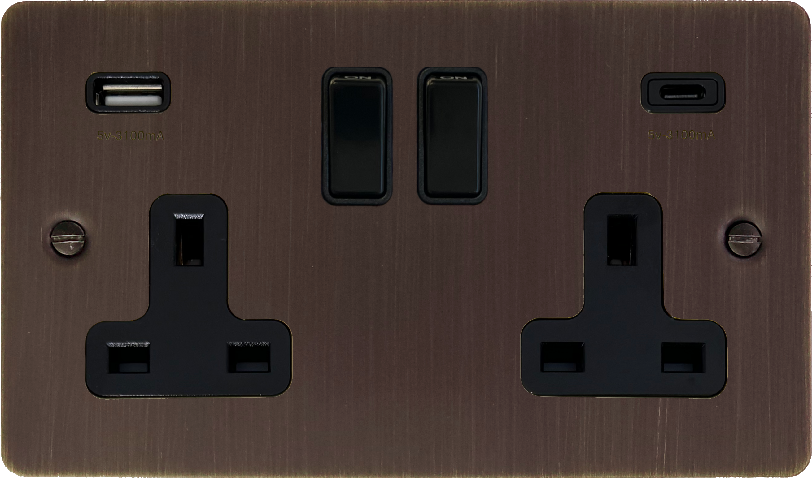 Flat Antique Copper Double Socket with USB (USB-A and USB-C/Black Switches) - G+H FAC911B