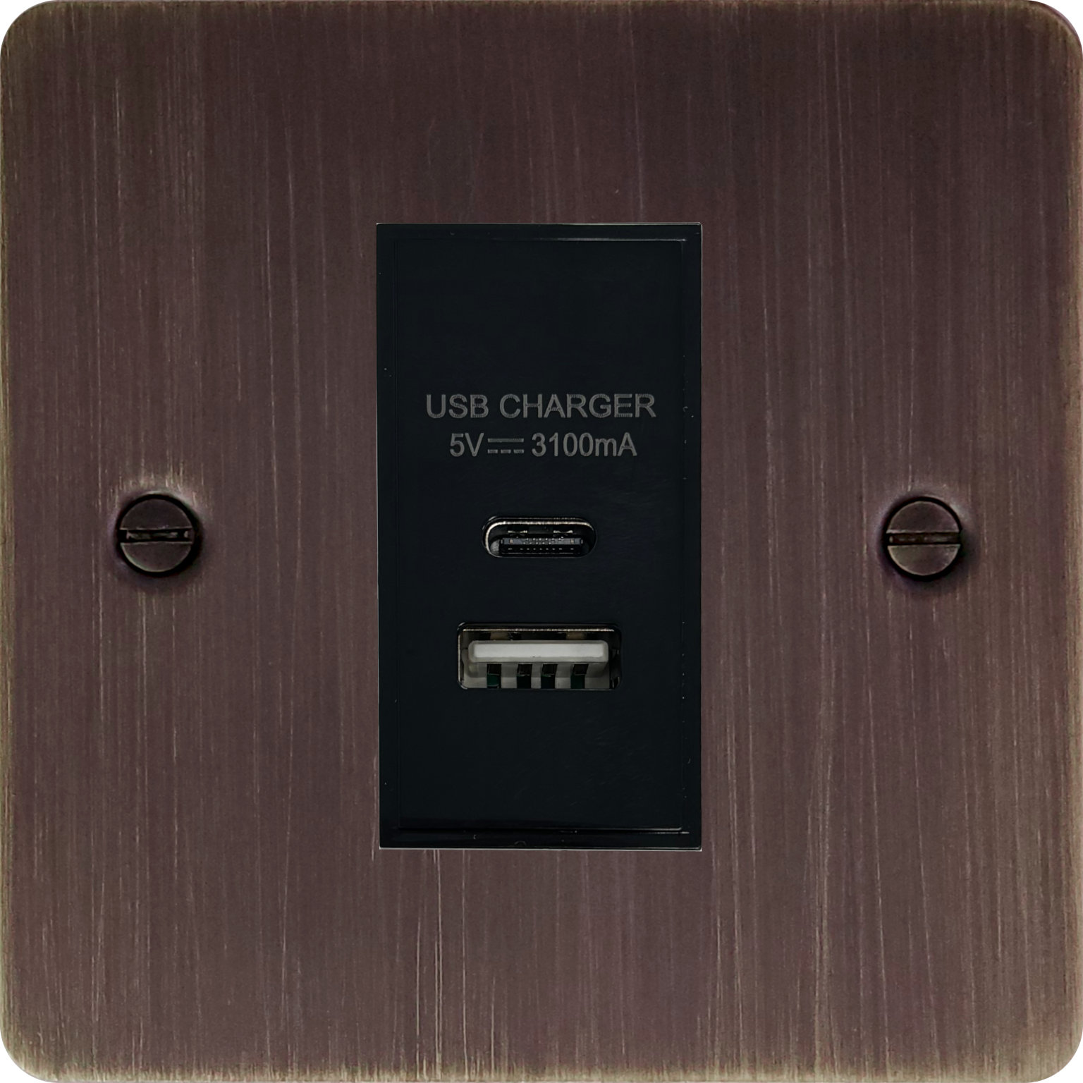 Flat Antique Copper USB Charger (USB-A and USB-C) (1 Gang/Black Insert) - G+H FAC41B