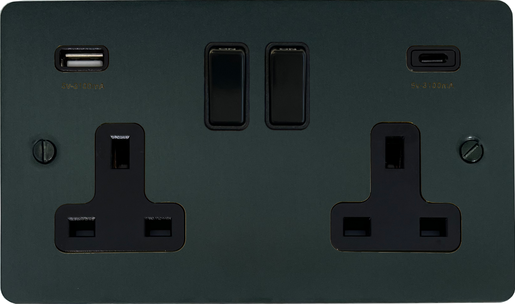 Flat Black Bronze Double Socket (2 Gang/USB-A and USB-C/Black Switches) - G+H FBB911B
