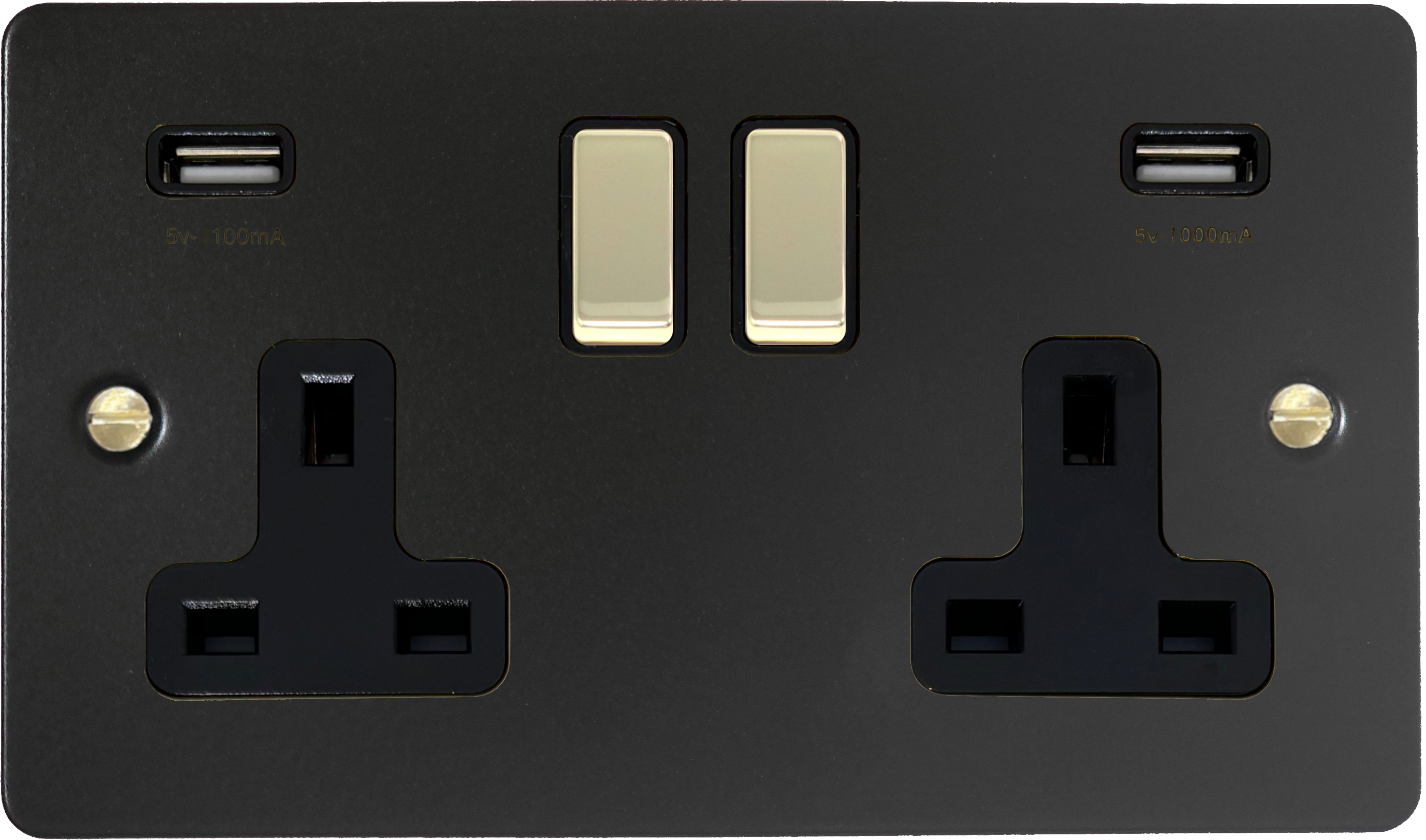 Flat Black Socket Double Socket With USB Sockets (Brass Switches/Black Inserts)