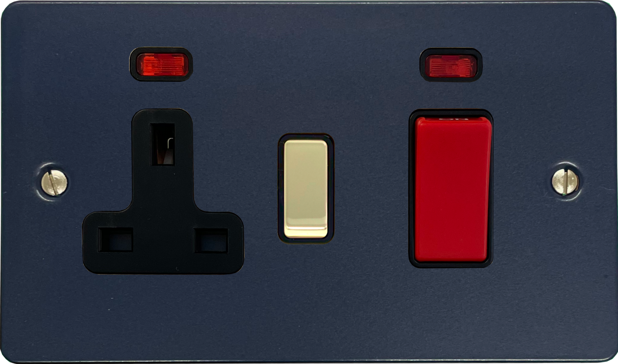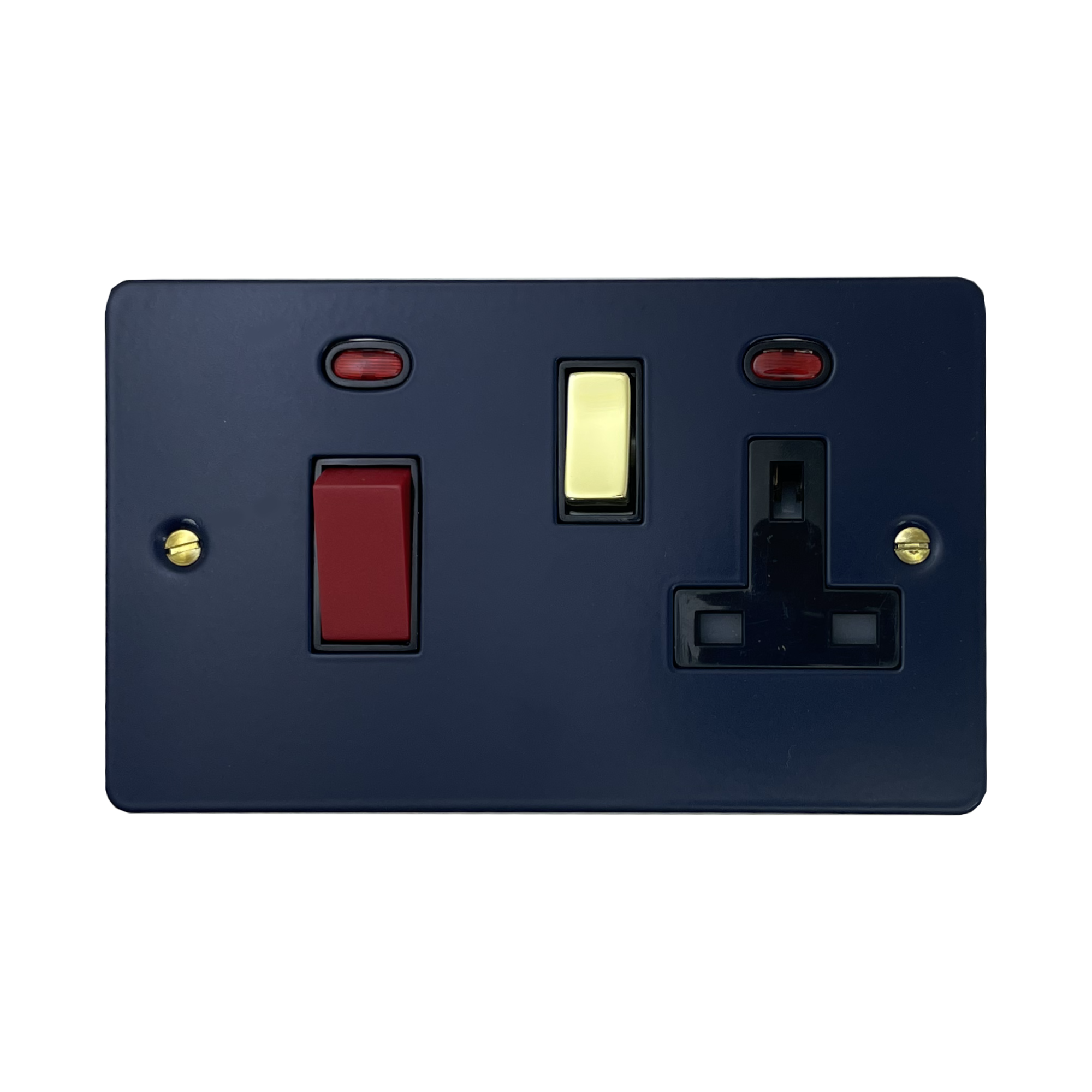 Flat Blue Cooker Switch with Socket (Black Insert/Polished Brass Switch) - G+H FRB329-PB