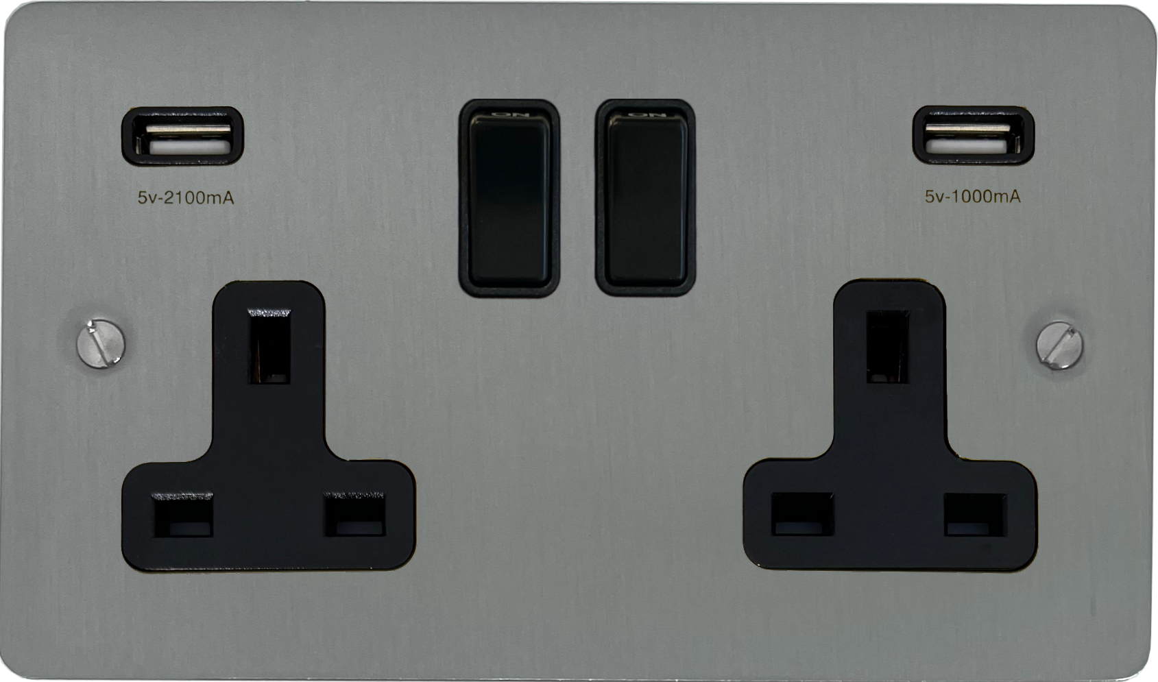 Flat Brushed Steel Double Socket with USB (Black Switch) - G+H FSS910B