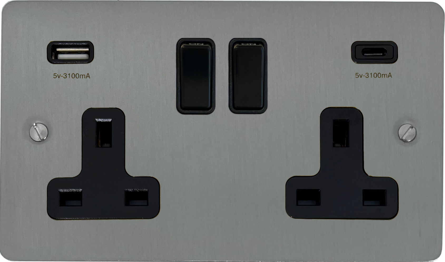 Flat Brushed Steel Double Socket with USB (USB-A and USB-C/Black Switches) - G+H FSS911B