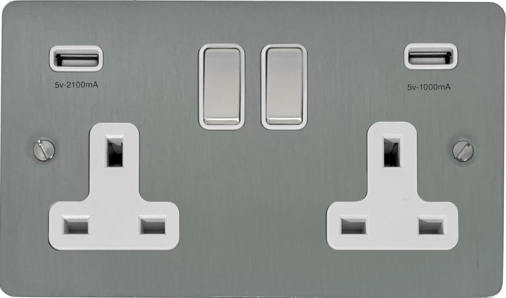 Flat Brushed Steel Double Socket with USB (White Insert/Satin Chrome Switches) - G+H FSS2910
