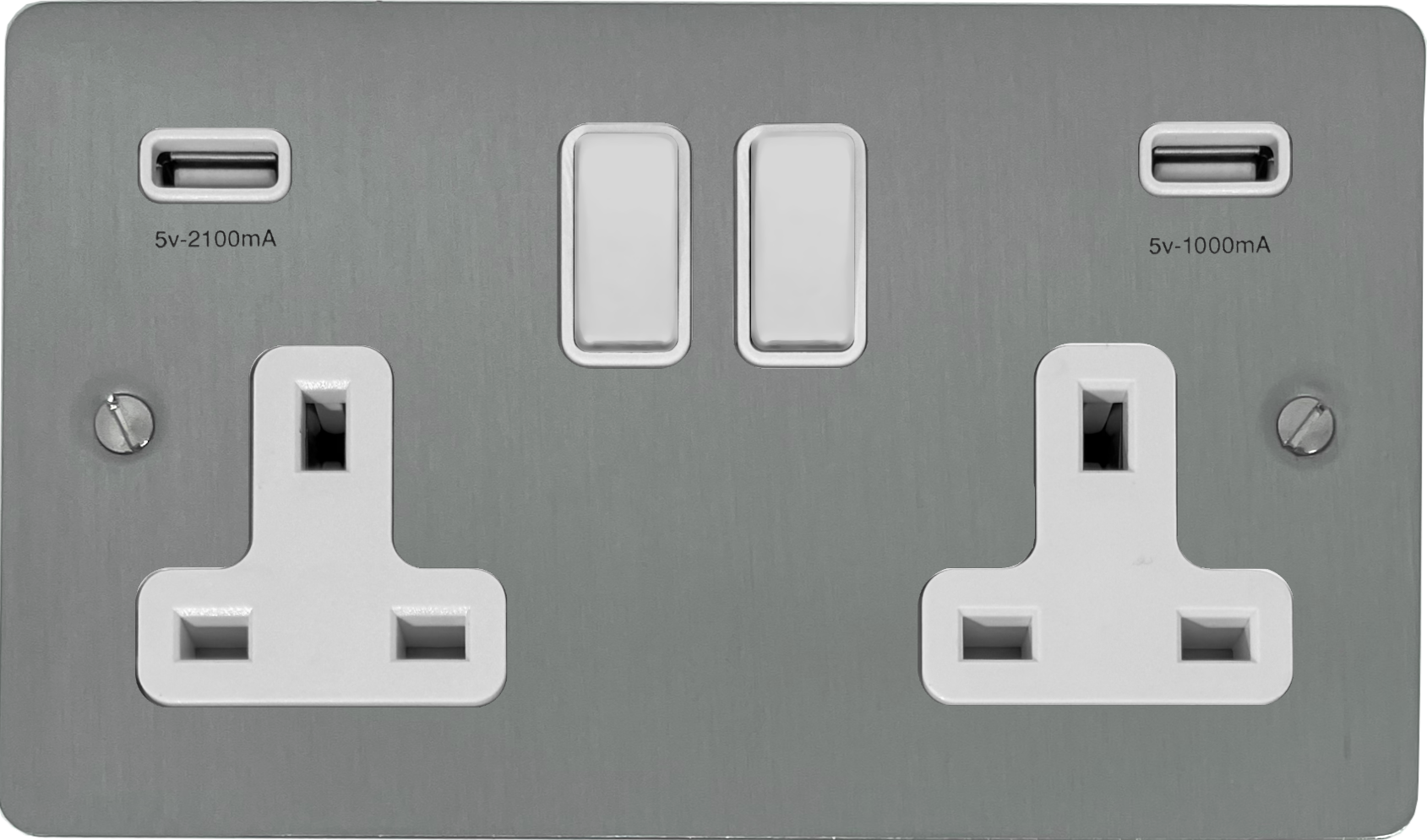 Flat Brushed Steel Double Socket with USB (White Switch) - G+H FSS910W