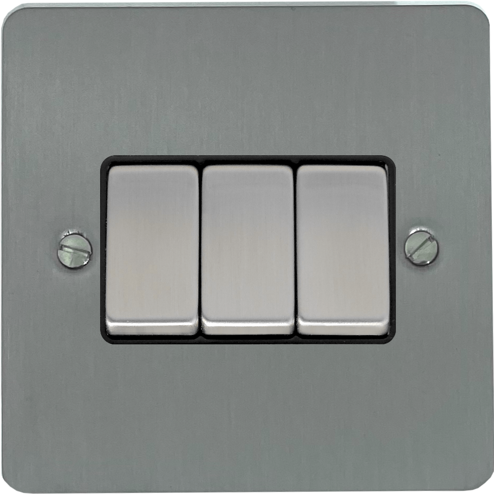 Flat Brushed Steel Light Switch (3 Gang/Black Insert/Satin Chrome Switches) - G+H FSS303