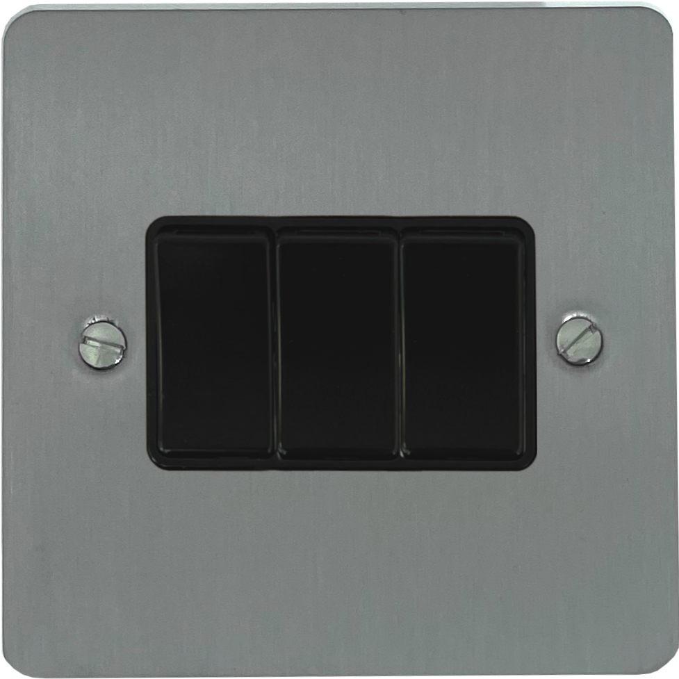 Flat Brushed Steel Light Switch (3 Gang/Black Switches) - G+H FSS3B